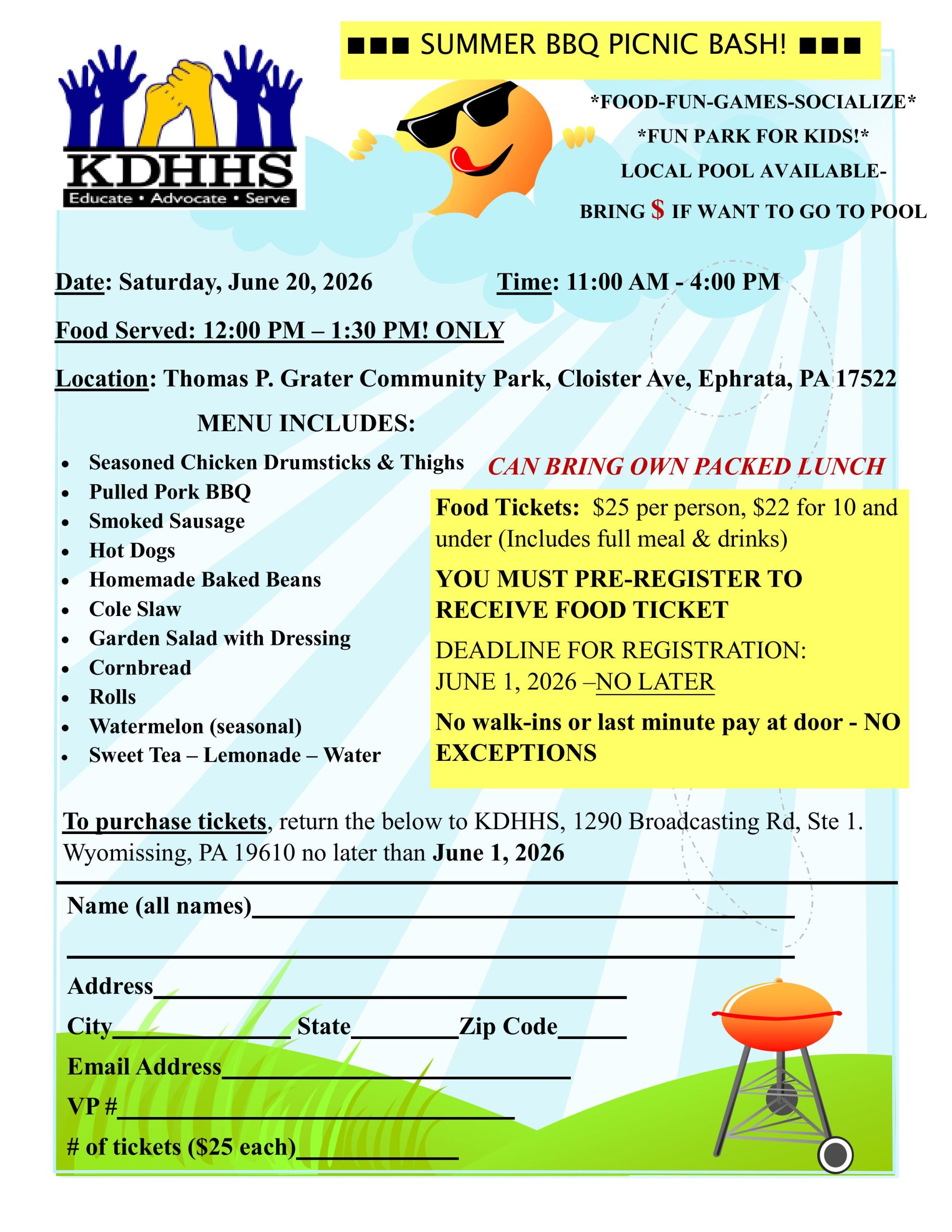 YOU MUST PRE-REGISTER TO RECEIVE FOOD TICKET - DEADLINE JUNE 1st - No walk-ins or paying at the door NO EXCEPTIONS